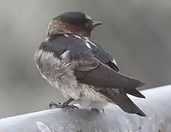 | Delichon urbicum (Linnaeus, 1758), sin. Delichon urbica (Linnaeus, 1758)[54][55] | Lăstun de casă, Rândunică de casă, Lăstun, Lăstrun, Loston, Lăstun alb, Rândunică de fereastră. | Delichon urbicum urbicum (Linnaeus, 1758) | Oaspete de vară, cuibărește. Cuibărește în locurile joase și la munte, adesea în colonii cu exemplare numeroase, lipindu-și cuiburile pe zidurile clădirilor. | Pentru România populația cuibăritoare este estimată la 400.000-1.300.000 de perechi cuibăritoare. | ![]() | |