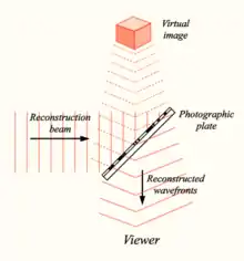 Pentru a reda imaginea înregistrată pe o hologramă trebuie să se developeze filmul și apoi așezat în poziția originală și iluminat doar cu un fascicul laser cu aceleași proprietăți cu cel cu care s-a înregistrat holograma. Figura de interferență holografică înregistrată va difracta fasciculul laser care traversează holograma și astfel se reconstruiește imaginea obiectului. Imaginea obținută are toate dimensiunile obiectului original și pare atât de reală încât observatorul este tentat să o atingă cu mâna, dar acesta întâlnește doar un fascicul de lumină focalizat.