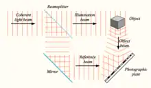 Pentru a obține o hologramă, fasciculul laser este divizat în două fascicule. Unul din acestea este reflectat pe obiect de unde ajunge pe filmul pe care se înregistrează holograma, iar celălalt este trimis direct pe filmul de înregistrare (fascicul de referință). Prin interferența fasciculului împrăștiat pe obiect și a fasciculului de referință se obține o figură cu linii microscopice luminoase și întunecoase. Figura este înregistrată pe film obținându-se o hologramă, care conține toate informațiile cu privire la amplitudinea și faza luminii difractate de către obiect.