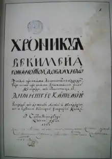 Hronicul vechimei a romano-moldo-vlahilor, scrisă între anii 1719 și 1722 în latină și tradusă apoi în română, este ultima operă a lui Dimitrie Cantemir. Pe coperta cărții traduse (imaginea alăturată), este scris cu litere chirilice că a fost tradusă în "limba româniască ", anul 1717, Sankt Petersburg.Titlul complet al lucrării este: "Hronicul vechimei a romano-moldo-vlahilor întâi pre limba lătiniască izvodit, iară acmu pre limba româniască scos."