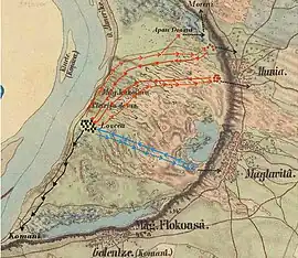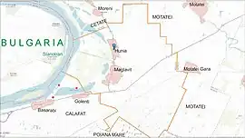 „Frontiera” administrativă dintre satul Hunia (comuna Maglavit) și satul Moreni (comuna Cetate) începe de la Dunăre, dintre punctele „La Dop” și „La Cazemate”, trece prin mijlocul Bălții Hunia (Balta Mare) și ajunge la DN 56A, de unde se continuă spre satul Moțăței (comuna Moțăței). „Frontiera” administrativă dintre satul Hunia (comuna Maglavit) și satul Maglavit (comuna Maglavit) începe de la Dunăre, puțin înainte de „Cazemată”, se continuă pe „Drumul Central”, întâlnește DN56A (între cele două sate) și se continuă spre satul Moțăței Gară (comuna Moțăței).