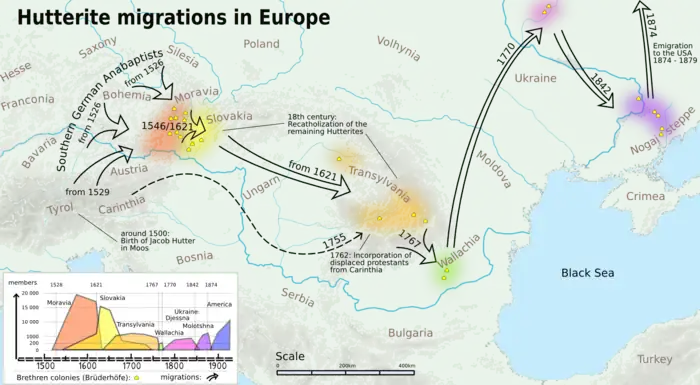 Jakob Hutter, fondatorul mișcării, a înființat primele colonii pe baza mărturisirii Schleitheim(de)[traduceți], o declarație de credință anabaptistă din 1527, iar primele comune au fost formate în anul 1528. De la moartea lui Hutter în 1536, credințele hutteriților, care îmbrățișează comunitatea de bunuri și nonrezistența, au dus la sute de ani de migrații în mai multe țări. Aproape dispăruți în secolul al XVIII-lea, au migrat în Rusia în 1770 și aproximativ o sută de ani mai târziu în America de Nord.