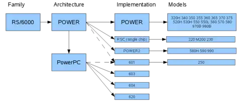 În februarie 1990, IBM produce RISC System/6000 (RS/6000) primul computer IBM cu arhitectură POWER. RS/6000 este împărțit în două nivele, POWERstation și respectiv POWERserver. RS/6000 are două configurații numite RIOS-1 și RIOS.9 sau POWER1 CPU. RIOS-1 are 11 cipuri: un cip de instrucțiuni cache, un cip întreg, un cip cu virgulă mobilă, patru cipuri cache de date, un cip de control al stocării, două cipuri I/O și un cip de ceas. RIOS.9 are 8 cipuri: un cip de instrucțiuni cache, un cip întreg, un cip cu virgulă mobilă, două cipuri de cache de date, un cip de control al stocării, un cip I/O și un cip de ceas.