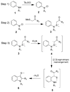 Pasul 3 îl constituie adiția unei baze (trietilamina). La temperatura camerei aceasta va deprotona ionul sulfoniu transformîndu-l înntr-un compus numit sulfon ilidă (o moleculă neutră din punct de vedere electric , dar care are sarcini electrice opuse la 2 atomi alăturați); sulfon ilida suferă o rearanjare de tip sigmatropic pentru a forma cetona 5.Aceasta formează prin deshidratare 3tiometilindol, compus care prin tratare cu Ni Raney elimină ionul de S, formînd astfel 3-H-indol.