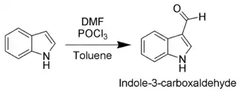 La indol, spre deosebire de pirol, poziția cea mai reactivă este poziția 3, de 1013ori mai reactivă fața de benzen.În sprijinul acestei teorii eset reacția Vilsmeyer-Haack