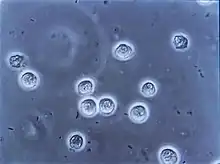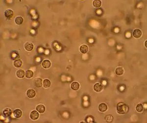 ![]() Mai multe leucocite observate în urina unei persoane cu infecție a tractului urinar prin microscopie | |
