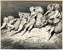 Guvernați de zeul grec al lumii subterane, Pluton, nenorociții din cercul al patrulea îndură o pedeapsă sisifică, fiind forțați să împingă cu pieptul roci enorme, simbol al ambițiilor și lăcomiei după bani. Ei sunt împărțiți în două părți: cei care acumulau posesii și cei care le-au risipit. Păcătoșii aceștia se canonesc atât de tare și se concentrează la munca lor atât de intens, că Dante și Virgil nu apucă să le adreseze vreun cuvânt. Printre aceste suflete, întrezărim oameni ai bisericii și chiar și papi.