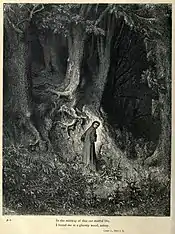 Dante în pădure, înainte de a intra în infern. Ilustrație de Gustave Doré