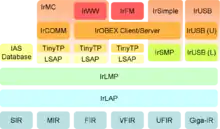 Standardele IrDa includ IrPHY, IrLAP, IrLMP, Tiny TP, IrCOMM, IrOBEX, IrLAN și IrSimple.