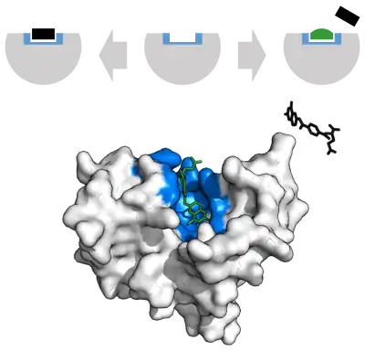 (albastru: situs de legare; verde: inhibitor; negru: substrat)