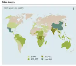 Consumul de specii de insecte variază în funcție de regiune din cauza diferențelor de mediu, ecosisteme și climă.[15][16] Numărul de specii de insecte consumate pe țară este cel mai mare în regiunile ecuatoriale și subtropicale, o reflectare a abundenței mai mari de insecte, a biodiversității observate la latitudini mai mici și a disponibilității acestora pe tot parcursul anului.[16][14][17]