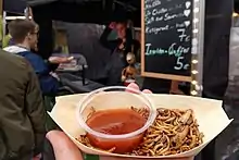 - Burger de insecte: chifteluțe de hamburger făcute din pudră de insecte/făină de insecte (în principal din viermi de făină sau din greier de casă) și alte ingrediente.[37]