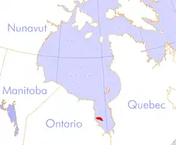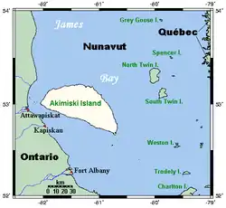 Capătul vestic al insulei Akimiski se află la doar 19 km distanță de malul vestic al golfului James.