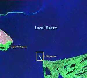 ![]() Poziția insulei în Lacul Razim (vedere satelitară) | |