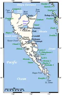 Harta insulelor Haida Gwaii; insula Graham este în partea de sus a imaginii