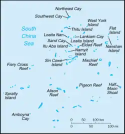 | Insule principale | Insula Itu Aba Insula Namyit Northeast Cay Insula Sin Cowe Southwest Cay Insula Spratly Swallow Reef Insula Thitu Insula West York |