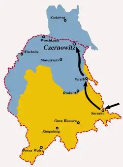 - autorități, militari și membrii ai populației ucrainene [din Bucovina] au acționat pentru preluarea conducerii în teritoriu, intenționând să guverneze în partea de nord,[14] formată din Cernăuți, bezirkurile Zastavna (germană Zastawna), Coțmani (germană Kitzman), Vășcăuți (germană Waschkoutz am Czeremosch) și Vijnița (germană Wiznitz) în întregime și în localitățile cu majoritate ucraineană din celelalte districte ale Bucovinei.[15]
