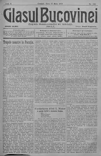 ![]() Prima pagină a ziarului Glasul Bucovinei din 27 mai 1919, furnizând date despre intervenția trupelor române în Pocuția | |||||||||||