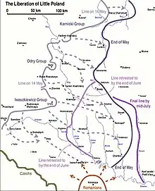 - o grupare, situată la nord, urma să înainteze pe direcția Chisălău (poloneză Kissiliev, germană Kisseleu) – Horodenka – Nezvîsko (Niezwiska)[41]