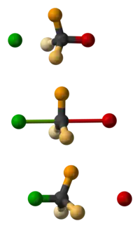 Reprezentare a celor trei etape a reacției SN2, în care se observă inversia Walden. Specia nucleofilă este colorată în verde, nucleofugul în roșu, iar substituenții în nuanțe de oranj.
