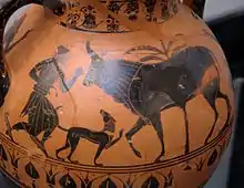 În mitologia greacă, Io era o tânără din cetatea Argos, preoteasă în templul zeiței Hera. Tatăl ei era un zeu al râului, Inachus, descendent al lui Oceanus. Se spune că Zeus a rămas impresionat de frumusețea acestei fete și s-a îndrăgostit de ea. Conform unei legende iubirea zeului pentru Io a fost cauzată de farmecele făcute de Iynx, fiica nimfei Echo. Tânăra fată a avut într-o noapte un vis, în care i se poruncea să meargă pe malul lacului din Lerna și să i se dăruiască lui Zeus. Io încearcă să refuze o uniune cu zeul, însă tatăl ei, sfătuit de oracolele din oracolul din Delfi și din Dodone, hotărăște să nu stârnească mânia divină și să se supună. Io a mers un câmp, iar Zeus a acoperit-o cu o perdea de nori pentru ca soția lui, Hera, să nu vadă adulterul comis. Hera bănuiește însă aventura, iar Zeus pentru a-și proteja iubita, o transformă într-o frumoasă junincă albă. Zeița însă nu se lasă păcălită și cere drept cadou juninca, apoi o încredințează în paza lui Argus, un monstru cu o sută de ochi și o rudă a tinerei Io.