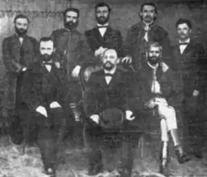 În picioare: Ioan Moțiu, jude de tribunal; George Secula, vicenotar, fisc comitatens; Ioan Frâncu, fisc comitatens; Haralambie Munteanu, notar la comitat; Ioan Coșeriu, asesor.