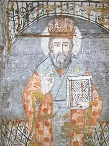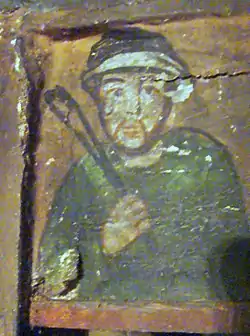 Fragment din inscripția aflată pe peretele dintre naos și pronaos semnată „Ioan diacu”; pe lângă hram şi nume de donatori inscriţia cuprindea, probabil, şi numele zugravului, care s-a şters