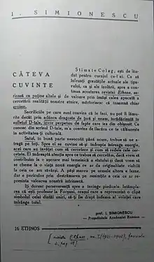 ![]() „Știința e sacră, dincolo de revoluții, de războaie, de curente politice, de coterii sau interese personale. Profesorul rămâne un apostol al neamului.” [1] | |
