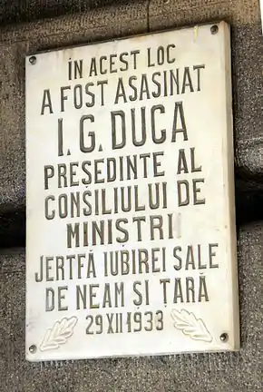 Ion Gheorghe Duca, adesea I. G. Duca sau Ion G. Duca / Ion Gh. Duca (n. , București, România – d. , Sinaia, Prahova, România) a fost un om politic liberal român. A fost inițiat în francmasonerie, când se afla la studii în Franța.[4] A deținut funcțiile de ministru al educației (1914-1918), ministru al agriculturii (1919-1920), ministru al afacerilor externe (1922-1926), ministru al afacerilor interne (1927-1928), și cel de-al 35-lea prim-ministru al României între 14 noiembrie și 30 decembrie 1933, la această ultima dată fiind asasinat de Nicadori din cauza eforturilor sale de a stăvili Mișcarea Legionară.[5]