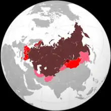 Extinderea maximă a Uniunii Sovietice (1955): Pactul de la Varșovia, Republica Populară Mongolă și Coreea de Nord.