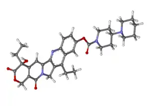 Irinotecan este un inhibitor al topoizomerazei I și este un derivat de camptotecină, un compus extras din planta Camptotheca acuminata.[10][12] Se află pe lista medicamentelor esențiale ale Organizației Mondiale a Sănătății și este disponibil ca medicament generic.[13]