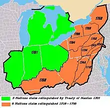 De-a lungul anilor 1670–1710 Cele Cinci Națiuni au ajuns să domine politic o mare parte din Virginia, la vest de Fall Line și până în valea râului Ohio în Virginia de Vest și Kentucky de astăzi. Ca urmare a Războaielor Castorilor, au izgonit triburile vorbitoare de siouan și au păstrat teritoriul ca teren de vânătoare prin dreptul cuceririi. Au vândut în cele din urmă coloniștilor britanici drepturile lor rămase la pământurile de la sud de Ohio în 1768, prin Tratatul de la Fort Stanwix.
