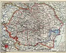 Formarea României întregite : Vechiul regat până în 1913 : violet ; teritoriile unite după Al Doilea Război Balcanic și după Primul Război Mondial : portocaliu (pierdute între timp) și trandafiriu (păstrate până astăzi)