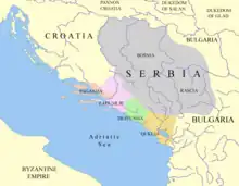 Conform datelor lui împăratului bizantin Constantin Porfirogenet, care a domnit în perioada secolului X, slavii au migrat din Serbia Albă(actuala Polonie și estul Germaniei) și s-au stabilit inițial în regiunea grecească Salonic. Datorită condițiilor nefavorabile, s-au stabilit într-o zonă mai nordică,[1] într-o regiune care se numea Provincia romană Illyricum. Pe coasta adriatică, sârbii au înființat patru cnezate costale cunoscute ca fiind Neretva, Zahumnlje, Konavle, Travunia și Doclea. Teritoriul se întindea din estul Alpilor Dinarici către nord spre Râul Sava, și cuprindea regiunea Bosniei. A păstrat vechiul nume Serbia numită adesea de către bizantini Serbia Botezată, datorită creștinării acesteia (spre deosebire de păgânii slavi din nordul Europei).[2]