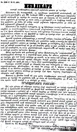 Publicarea pentru populațiunea ambelor regimente române de graniță” din 18 februarie 1851 de către baronul Ludovic de Wohlgemut, „feldmareșal-locotenente și guvernator civil și militar al Transilvaniei”, pe lângă că făcea cunoscută grănicerilor „preaînalta mulțumire împărătească pentru credincioasele servicii pe care le-au făcut, ca trupe de graniță, atât înăuntrul țării cât și înaintea dușmanului”, recomanda ca după depunerea armelor și „trecerea la viața pașnică”, foștii grăniceri să rămână alipiți tronului, să dea ascultare și să dovedească o credincioasă împlinire a datoriilor către noile dregătorii, să fie vrednici și în viitor de numele cel bun, câștigat pe dreptate, să fie ca și până atunci ostași și cetățeni bravi și loiali.[65]