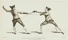 În paralel se dezvoltă școala franceză, caracterizată de folosirea floretei, o armă similară cu rapiera, ci mai ușoară, suplă și având în vârf o bucată de pânză („butonul”). Acesta se ține în aproape același mod ca floreta modernă. În Les Vrais principes de l'espée seule (1670), Philibert de la Touche define o a cincea gardă și mesura, „durata de execuție a unei acțiuni. A prinde timpul este a profite de timpul folosit de adversarul pentru a executa o acțiune sau o mișcare pentru a-l lovi.” Mesura este „situația în care ești suficient de aproape de adversarul pentru a-l lovi sau a fi lovit de el.” Define și contraatacul, pe care îl numește le même temps (literal „același timp”), și contratimpul.[24] Se dezvoltă jargonul scrimei, pe care Molière îl preia în scopuri comice în Burghezul gentilom.