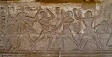 Prima competiție de scrimă cunoscută datează din a V-a Dinastie Egipteană: un relief din piramida lui Sahure (cca. 2496–2484 î.Hr.) reprezintă un concurs sportiv cu probe de tir cu arcul, lupte și scrimă cu bastoane lungi. Scene din același tip pot fi regăsite și pe mormântul lui Kheruef la Luxor (cca. 1390-1352 î.Hr) și pe pereții sculptați ai templului lui Ramses al III-lea (cca. 1186–1155 î.Hr.) de la Medinet Habu. Acestea arată că bastonul are un metru în lungime, cu diferite tipuri de mâner. Este mânuit ca o sabie olimpică, adică o armă de împungere și de tăiș: loviturile se pot executa cu vârful și cu laturi ale bastonului. Acestea sunt parate cu brațul neînarmat. Scrimerii poartă protecții pentru antebraț, față și mână înarmată, și vârful bastonului este protejat cu o bucată de piele. Arbitri, identificati de o pană, supraveghează asalturile. Comentariul hieroglific de la Medinet Habu atestează că există reguli precise[2]. Scrimerii se strigă reciproc: „În gardă! Și admiră ceea ce va face mâna mea.” Spectatorii fac galerie pentru luptătorii lor favoriti. Un scrib este însărcinat cu notarea scorului.