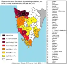 Ponderea vorbitorilor limbii italiene ca limbă maternă în peninsula Istria (2001)