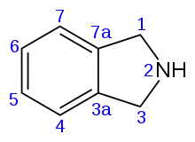 Izoindolina este un compus organic cu formula chimică C8H9N.[2] Este un compus heterociclic biciclic, format dintr-un nucleu benzenic cu șase atomi fuzionat cu un nucleu cu cinci atomi, care conține azot. Se regăsește în structura unor medicamente, precum clortalidonă, indoprofen sau lenalidomidă. Este obținută din ftalonitril.