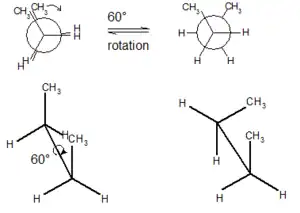 Rotația în jurul unei legături simple în cazul butanului conduce la interconversia conformerilor. În dreapta avem conformația intercalată, iar în stânga conformația eclipsată (ca o stare de tranziție, întrucât este forma cea mai instabilă termodinamic).