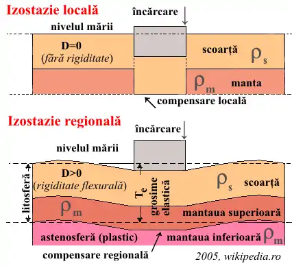- în plan vertical: flotabilitatea, datorată diferenței de densitate dintre densitatea litosferei și a mantalei litosferice [ Δρ = ρa - ρl ];
