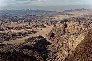 ![]() Pohled z vrcholu hory Umm ad-Dámí na okolní skalnatou pustinu | |