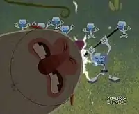 Jack pregătește o capcană: face un laț din liane, pune un morcov în mijloc și se ascunde într-un tufiș așteptând să apară vreo sălbăticiune. Curând, un mistreț se apropie curios și adulmecă morcovul, însă deodată pământul se zguduie și se aude un muget care sperie atât mistrețul, cât și pe Jack. Dintre tufe iși face apariția un patruped blănos, mare și rotofei, fugind de mama focului, iar pe urmele lui, alți trei blănoși, dar călăriți de trei indivizi pitici și albaștri. Blănosul fugărit calcă în laț și îl târăște pe Jack după el, căci Jack își legase celălalt capăt al funiei de propriul picior. Jack se cațără pe blănos și îl oprește din alergare, împiedicându-i picioarele.