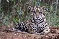 Jaguarul[3] (Panthera onca), numit și tigru american,[4] este o specie de felidă mare și singurul membru viu din genul Panthera originar din Americi. Cu o lungime a corpului de până la 1,85 m și o greutate de până la 158 kg, este cea mai mare specie de felidă din Americi și a treia cea mai mare din lume. Coloritul cu semne caracteristice al blănii prezintă păr de culoare galbenă pală până la alutacee, marcat cu puncte ce fac trecerea către rozetele(en)[traduceți] de pe părțile laterale, dar coloritul blănii la unii indivizi este în schimb negru, acest aspect fiind provocat de melanism. Mușcătura puternică a jaguarului îi permite acestuia să străpungă carapacele(en)[traduceți] țestoaselor și să se folosească de o metodă neobișnuită pentru a ucide: mușcă direct prin craniul prăzii mamifere între urechi pentru a aplica creierului o lovitură fatală.