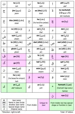 Alfabetul jawi există din secolul al XIII-lea în lumea malaeză. Dezvoltarea sa este legată de cea a Islamului. Jawi este constituit din literele alfabetului arab, cu câteva caractere speciale, pentru redarea fonemelor proprii limbii malaeze.