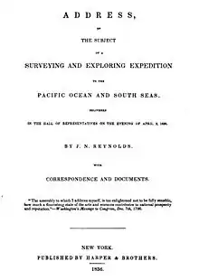În numărul din ianuarie 1837 al Southern Literary Messenger, Edgar Allan Poe a recenzat Address, on the Subject of a Surveying and Exploring Expedition to the Pacific Ocean and South Seas (New York, 1836) first given to the House of Representatives on 2 aprilie 1836 al lui Reynolds.[9]