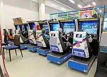 În schimb, multe jocuri de curse arcade din arcadele de distracție folosesc frecvent dulapuri de arcade cu simulatoare de mișcare hidraulice care simulează aspectul și senzația de a conduce un vehicul. De exemplu, o motocicletă pe care jucătorul stă și se mișcă pentru a controla acțiunea de pe ecran sau un dulap asemănător mașinii (cu scaune, volan, pedale și schimbător de viteze) care se mișcă în sincron cu acțiunea de pe ecran. Acest lucru a fost obișnuit în special pentru jocurile de curse arcade de la Sega încă din anii 1980.[1][2] Cu toate acestea, acest lucru poate fi găsit de obicei numai în jocurile de curse arcade pentru cele de distracție, mai degrabă decât în jocurile de curse în stil arcade pentru sistemele de acasă.