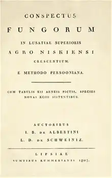 - B. de Albertini et D. de Schweinitz: „Conspectus Fungorum in Lusatiæ superioris agro Nieskiensi crescentium e methodo Persooniana. Cum tabulis XII, æneis pictis, species nova XCIII sistendibus”, Editura Sumtibus Kummerianis, Leipzig 1805