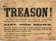 John Brown (n. , Torrington(d), Connecticut, SUA – d. , Charles Town(d), Virginia, SUA) a fost un lider aboliționist american. A ajuns cunoscut pe plan național mai întâi pentru aboliționismul său radical și pentru luptele din Bleeding Kansas. În cele din urmă, a fost capturat și executat pentru o tentativă de instigare a sclavilor la răscoală(d) la Harpers Ferry(d) înainte de Războiul Civil American. Brown avea convingeri religioase puternice,[10][11] și credea că este „un instrument al Domnului”,[12]:248 crescut pentru a da lovitura de moarte sclaviei americane, acțiune pe care o considera o „obligație sfântă”.[12]:189[13][14] Brown a fost principalul exponent al acțiunii violente în cadrul mișcării aboliționiste americane:[15]:426 el credea că violența este necesară pentru a pune capăt sclaviei americane, deoarece decenii de eforturi pașnice au eșuat.[12][13][16] Brown a spus în repetate rânduri că, lucrând pentru a-i elibera pe sclavi, el urmează Regula de Aur[17][18] și Declarația de Independență a SUA, care afirmă că „toți oamenii sunt creați egali”.[19][20][21][22]:721[23] El a afirmat în mod repetat că, în opinia sa, aceste două principii „înseamnă același lucru”.[24]