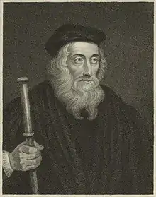 John Wycliffe [3] (n. ca. 1320 la Ipreswell (actualmente Hipswell), Yorkshire, Anglia – d. 31 decembrie 1384 la Lutterworth (lângă Leicester)). John Wycliffe a fost un preot și teolog catolic englez care a invocat laicizarea proprietăților bisericești din Anglia. John Wycliffe a invocat limitarea influenței bisericești asupra puterii politice laice din Anglia. Una din cele mai importante contribuții controversate a fost traducerea Vechiului Testament și cea a Noului Testament din latină în engleză, care sunt fundamentul versiunii consacrate a Bibliei Regelui James. Una din figurile istorice cele mai importante care au fost influențate de John Wycliffe, prin intermediul lui Hieronymus din Praga, a fost Jan Hus, (1369-1415).